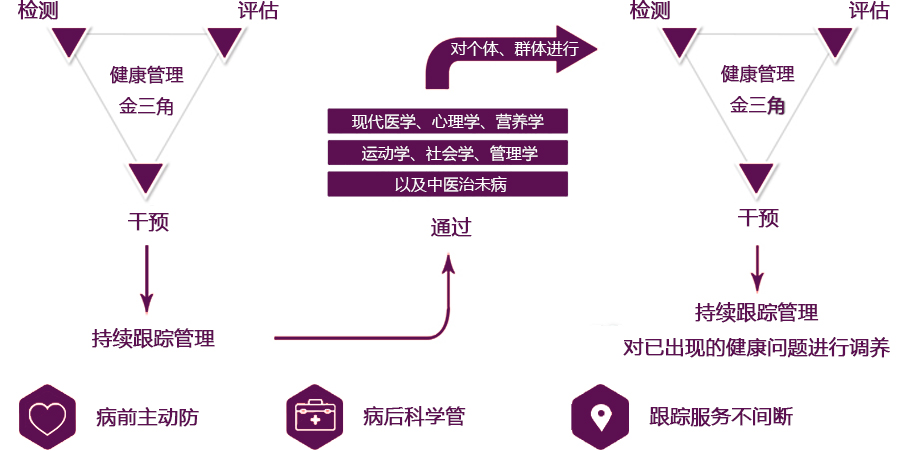 美馨以体检为基础,运用健康管理金三角的模式创造性的提出自己独特的健康管理模式,为客户提供病前、病中及病后的全方位系统化的健康服务。